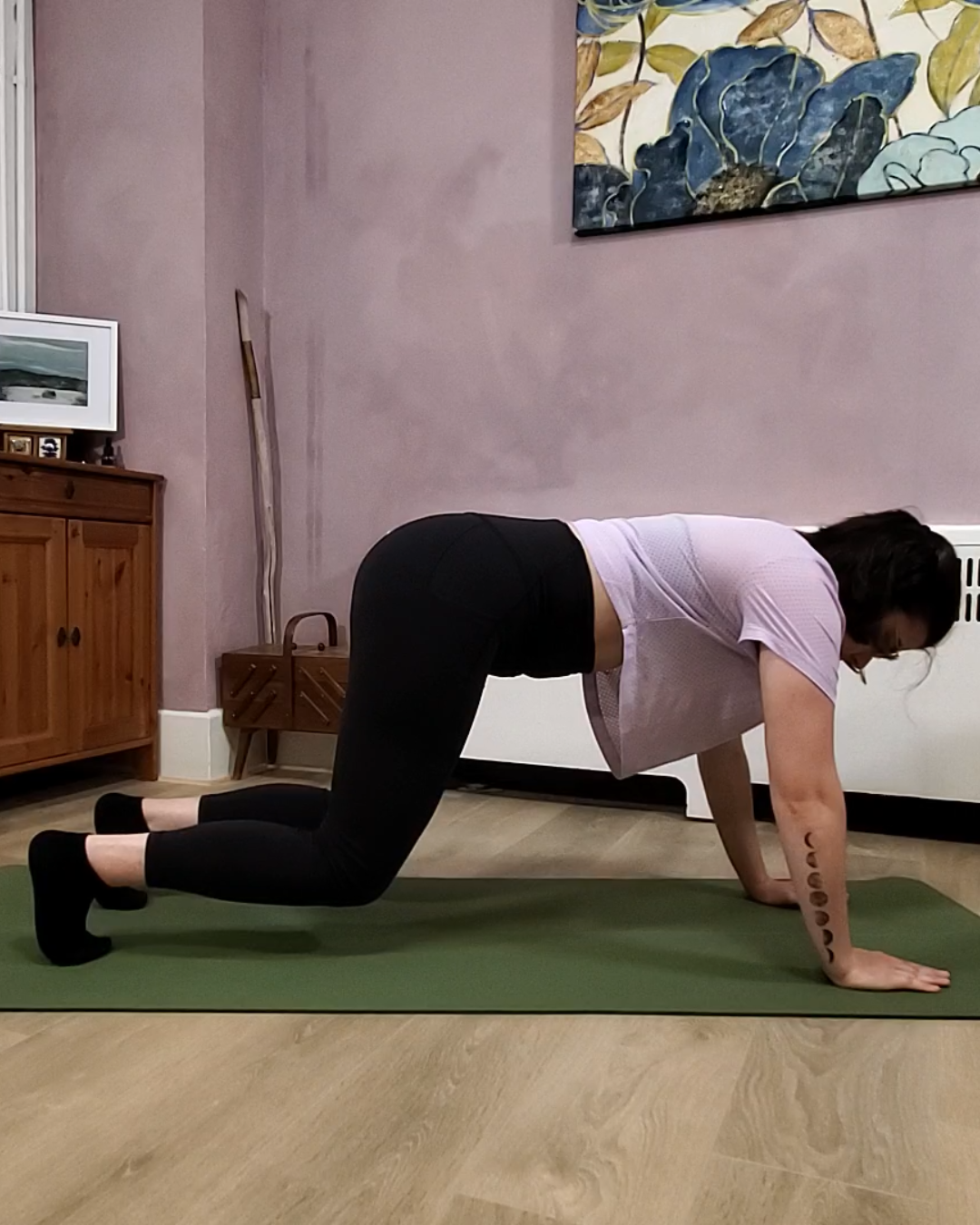Ici, c’est dans des variations de bird dog et de planches que j’aime bien travailler le plancher pelvien.